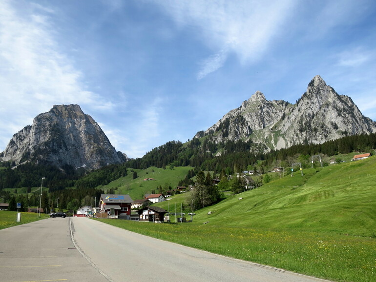 Da für den Nachmittag Regen angesagt war begnügten wir uns mit einer Fahrt ins Muotatal. Von Einsiedeln ging es über Alpthal nach Brunni, zu Fusse der Mythen. Östlich dieser zwei berühmten Schwyzer Gipfel führte eine kleinen Strasse zu einer Alpwirtschaft und von dort ein Feldweg zum Ibergeregg-Pass. Diese Strecke war besonders bei Mountainbikern sehr beliebt, aber auch mit den beladenen Trekkingbikes fahrbar.